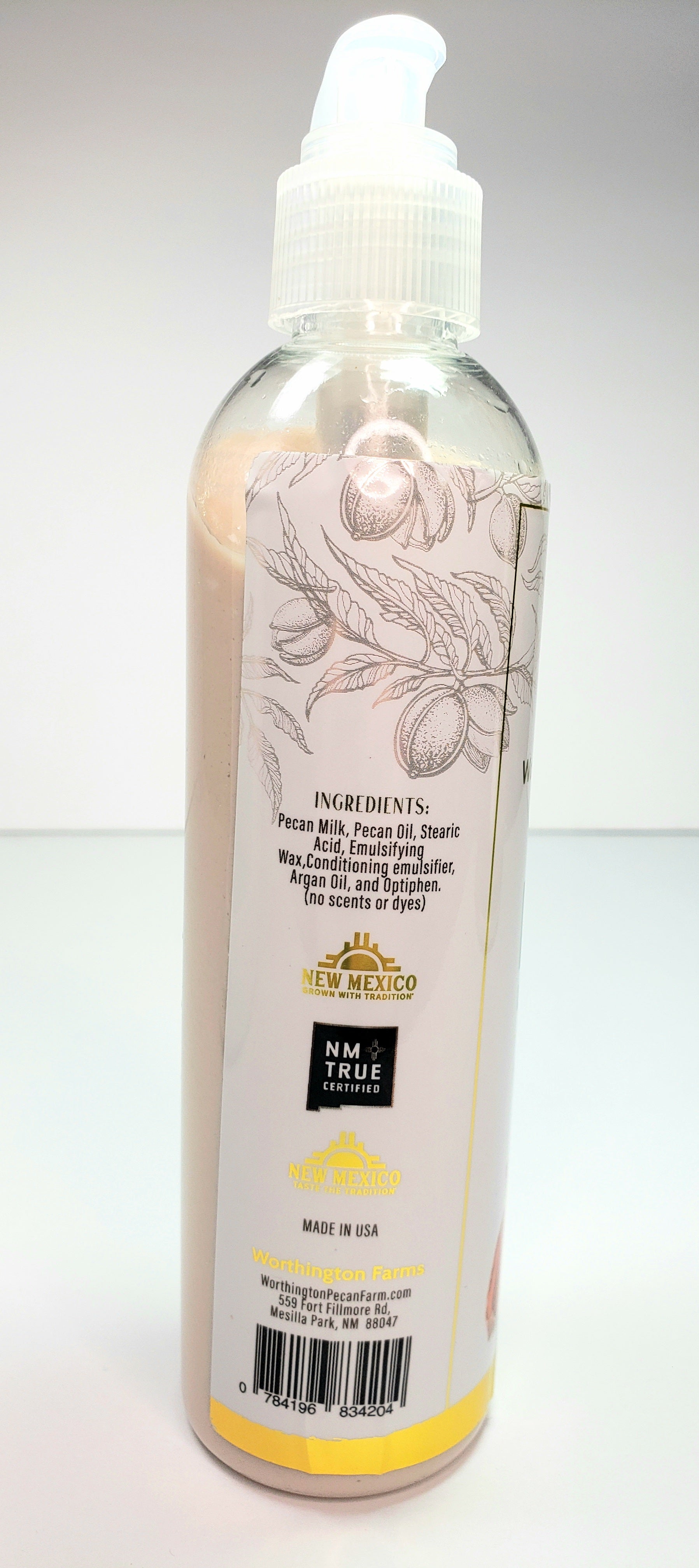 Our Creamy Pecan Lotion is made with all natural ingredients with no dyes or perfumes. The main ingredients for this lotion are pecan oil and pecan milk.