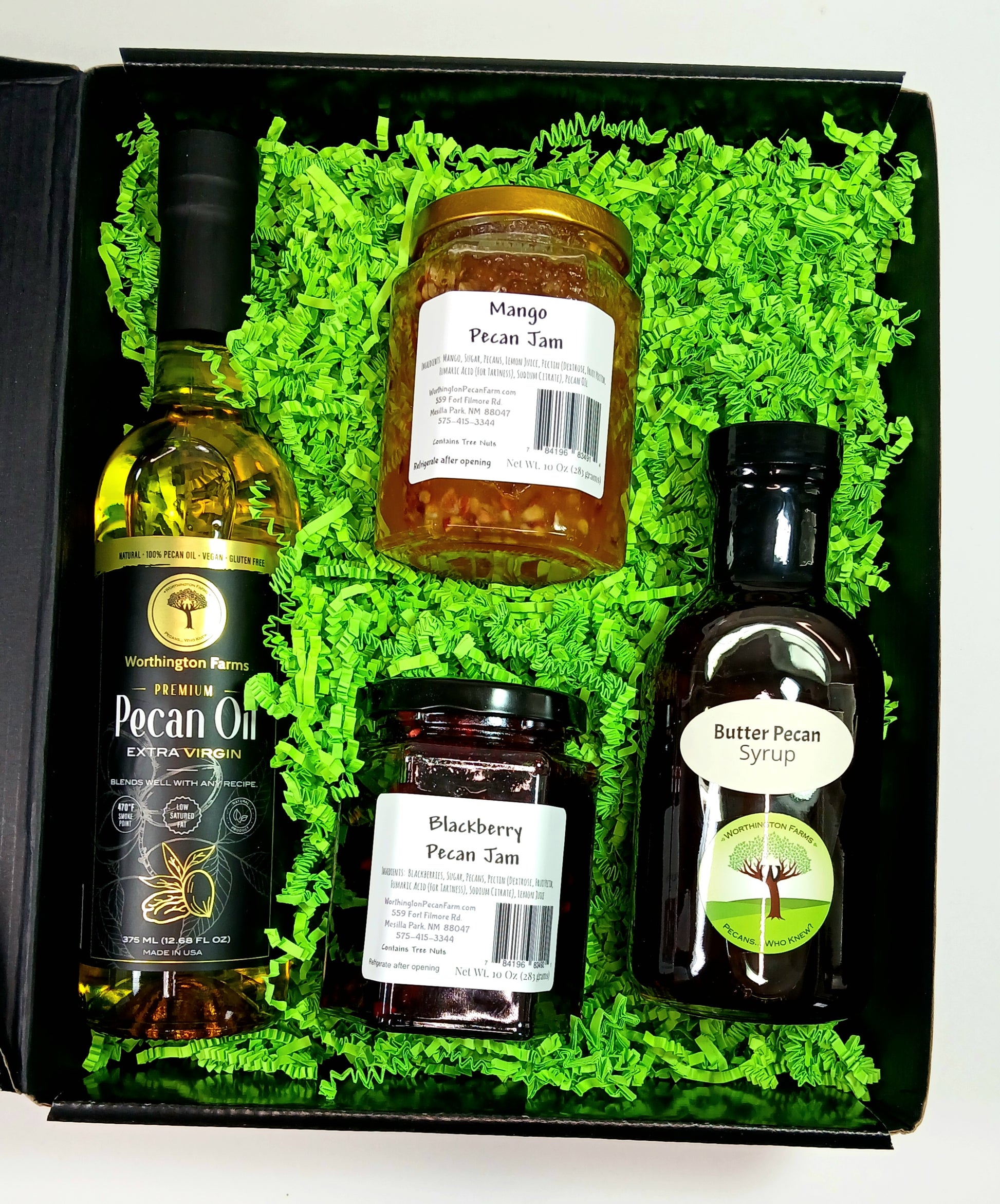 This is perfect for your food loving friends and family. It includes a Butter Pecan Syrup, Pecan Oil, and 2 jams (varieties include Cherry Amaretto,