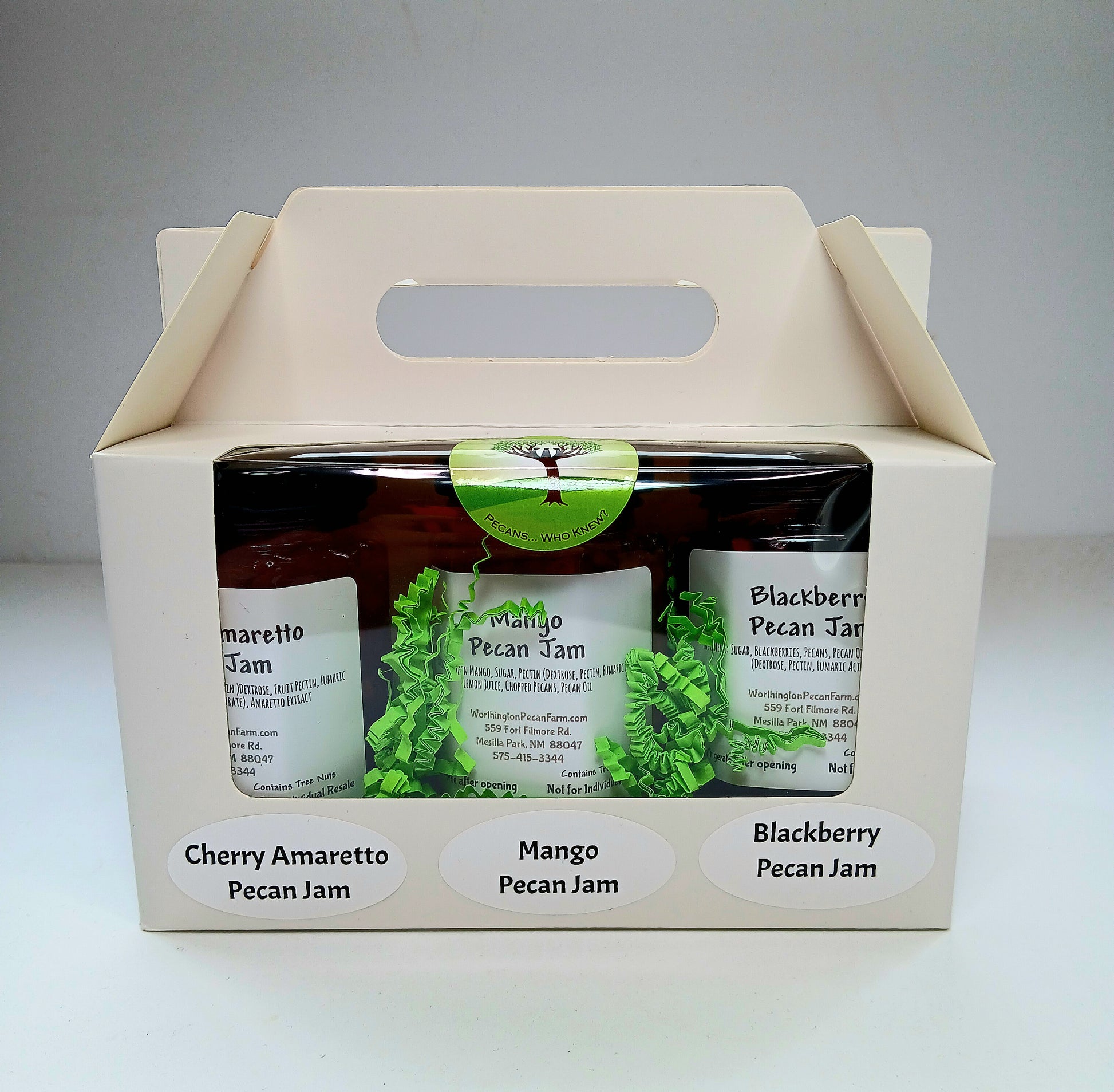 Not sure what jam you want to try? With this gift set you can try all three!! Three 4oz jars, with Cherry Amaretto, Mango, and Blackberry Pecan Jam.